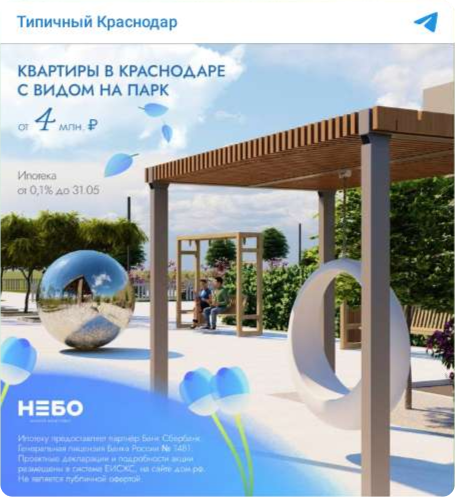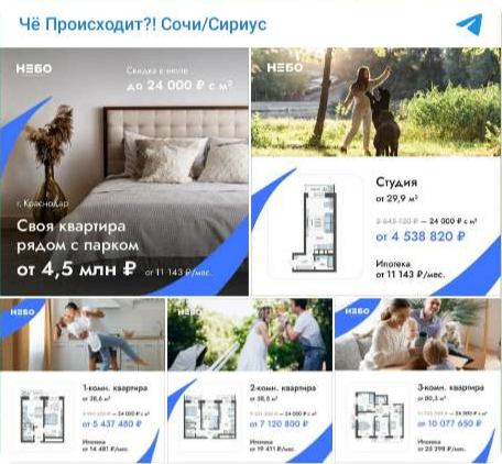 С первым вариантом баннеров — каруселью планировок — мы разместились во всех каналах Краснодарского края, которые были доступны на бирже в тот момент. Во второй и последующие месяцы аудитория хуже реагировала на посты, из-за чего в том числе росла стоимость обращения.