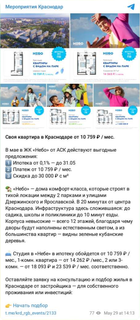 В первый месяц отобрали каналы Краснодара и края, других российских городов, а также взяли в работу каналы, связанные с тематикой недвижимости — т.е. без жесткой привязки к ГЕО.
